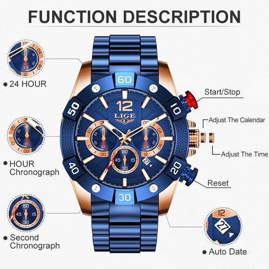 Chronograph Herrenarmbanduhr aus Edelstahl mit großem Zifferblatt und Leuchteffekt